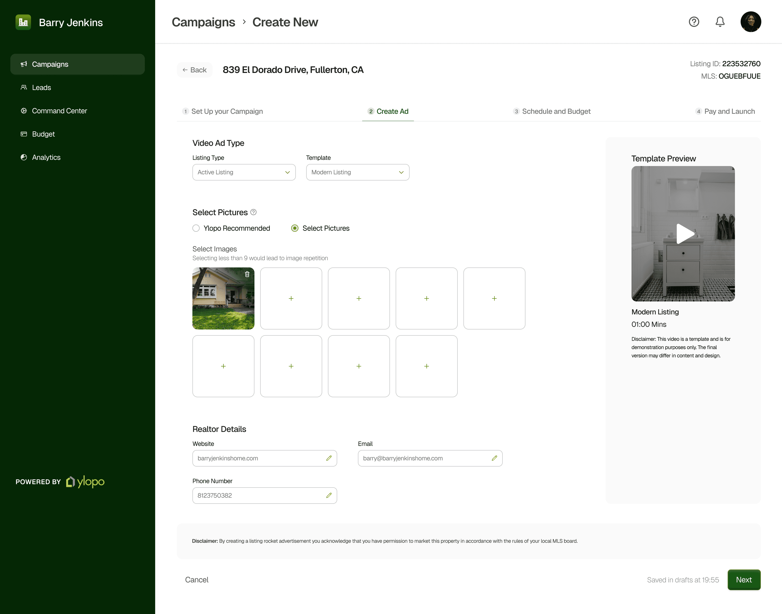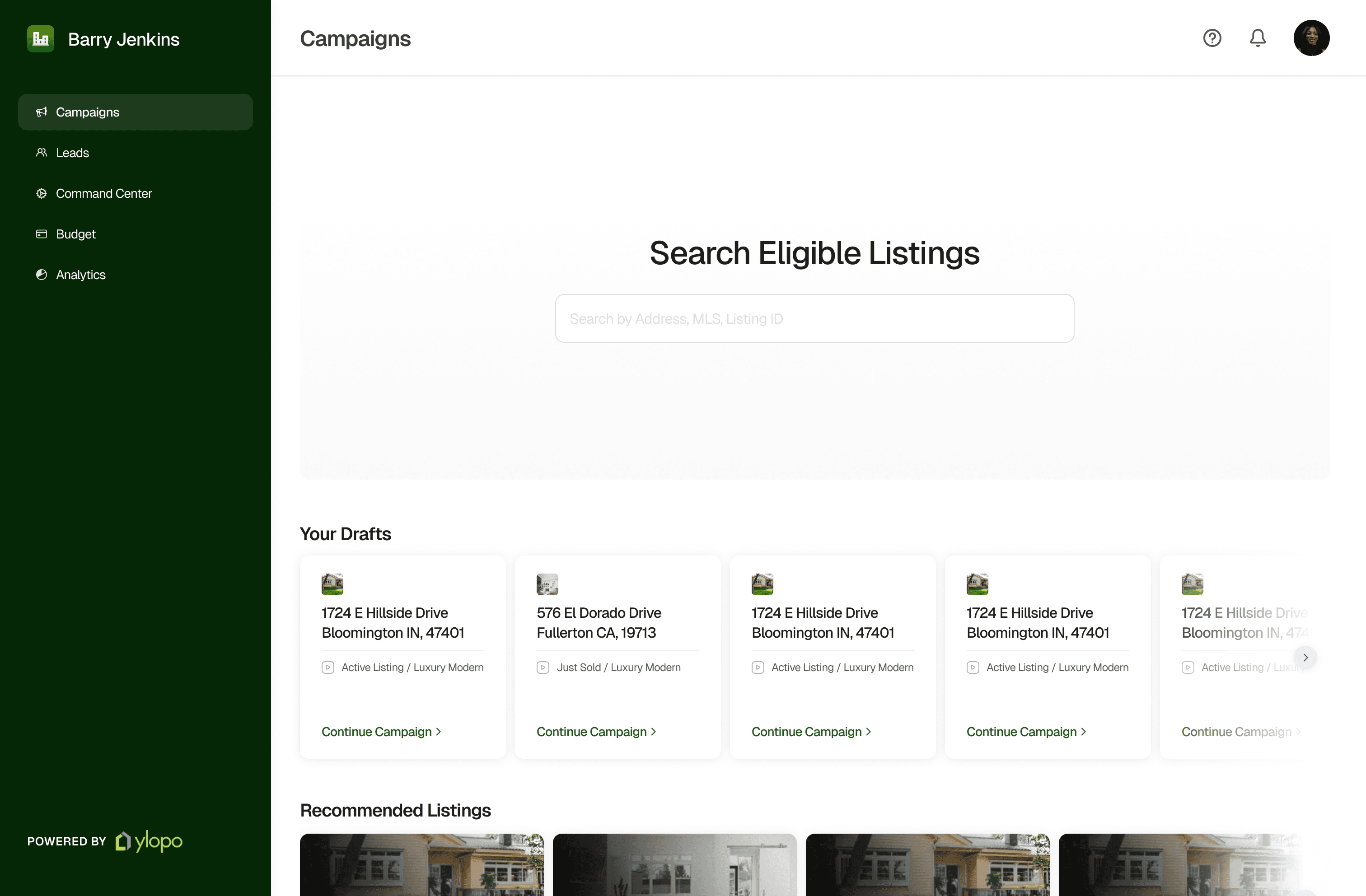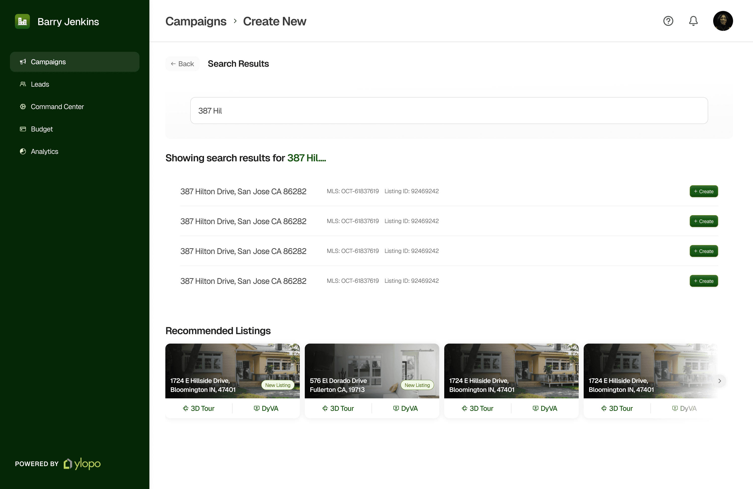 The new listing cards display the basic informations about the listing’s locations before clicking on the agent’s preferred type of Campaign type. These play a dominant role in shaping the visual experience and aligns with ylopo’s intention to encourage the real estate teams to find more listings conveniently.